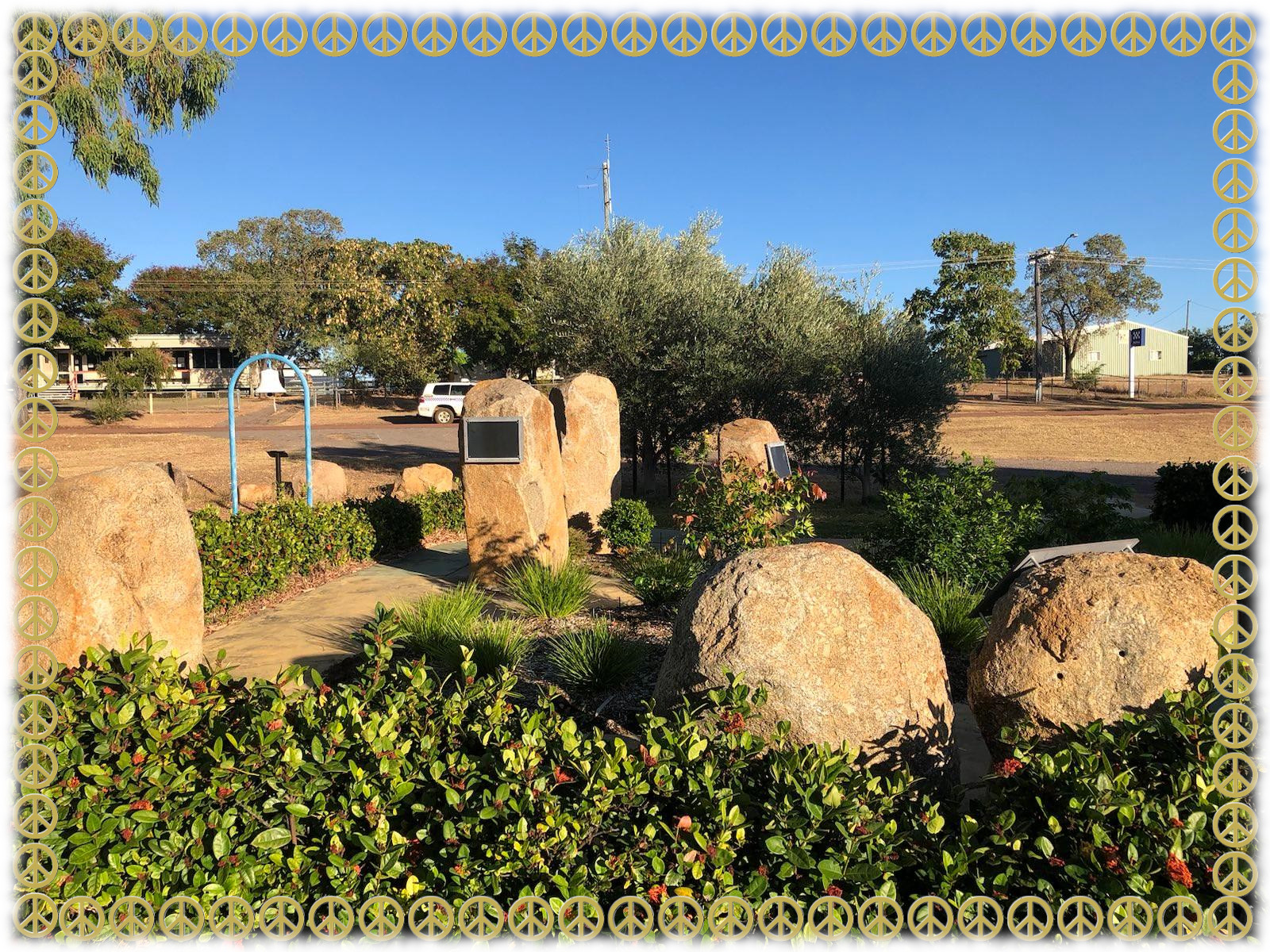 As part of the town park, opposite the Police Station, a space is allocated for the “Peace Garden” including a large bell, which is rung once daily reminding all of importance of peace in the world.